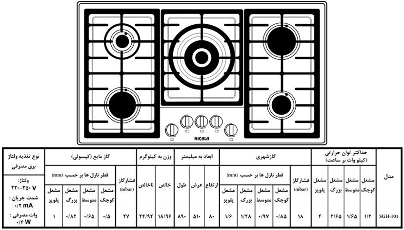 -جنس شبکه چدن -توان حرارتی شعله بزرگ 2.65 کیلو وات بر ساعت 2 عدد - توان حرارتی شعله متوسط 1.65 کیلو وات بر ساعت - توان حرارتی شعله کوچک 1.25 کیلو وات بر ساعت |