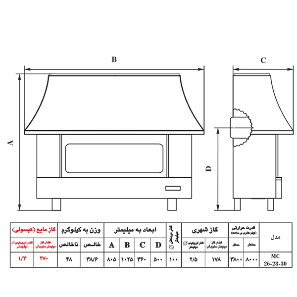 بخاری گازی نیک کالا طرح شومینه مدل سیمین MC-26 با توان حرارتی بسیار بالا تمام محیط را در روزهای سرد زمستانی گرم می کند. این بخاری مجهز به سنسور اکسی پیلوت (کنترل اکسیژن) می باشد که سلامتی افراد را تضمین و از بروز هرگونه خطری جلو گیری می کند. بخاری گازی نیک کالا طرح شومینه مدل سیمین MC-26 با روکش لعاب نسوز طراحی شده که زیبایی خاصی به دکوراسیون محیط خانه و یا محل کار می بخشد. این بخاری با گاز شهری تنظیم شده است و چنانچه الزاما تصمیم به استفاده از گاز مایع (کپسول) داشته باشید باید تغییراتی در سیستم سوخت بخاری (پیلوت، اوریفس، ...) به عمل آید که این امر باید حتما توسط سرویس کاران آموزش دیده (مجاز) نیک کالا انجام شود.کیفیت بخاری های گازی نیک کالا امروزه فقط به ظاهر آراسته و طراحی صنعتی آن نیست . در این بخاری ها با ارتقاء بازدهی حرارتی حدود 20 درصد مصرف گاز کاهش یافته و با صرفه جویی مبلغی را که برای خرید بخاری پرداخت شده است از طریق صرفه جویی به شما باز می گردد . طراحی بخاری زیبا بوده و استاندارد ملی ایران ، استاندارد CE و TSE کیفیت محصول را تایید کرده اند .